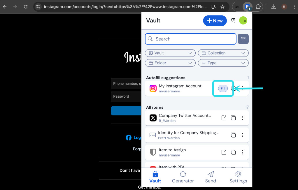 Vaults view, and selecting the Fill button.Browser extensions will warn users before using this method to autofill an untrusted iframe or on an HTTP site when HTTPS is expected based on that item's saved URI(s).