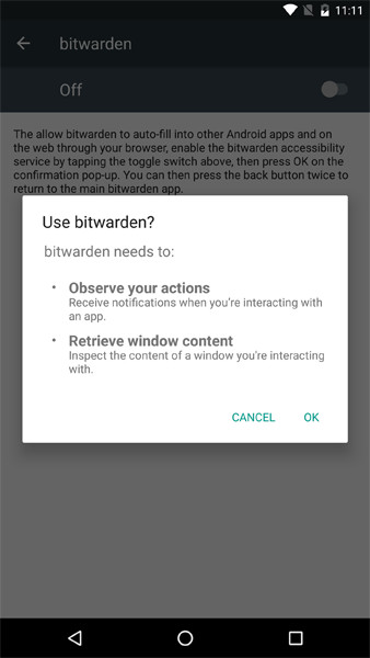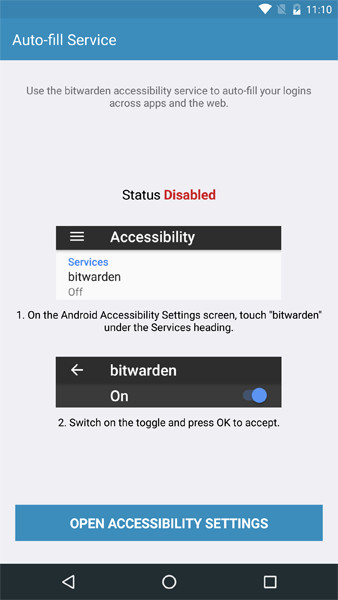 The auto-fill service is built on top of a feature in Android called accessibility services. Accessibility services give Bitwarden the ability to monitor other apps and webpages outside of the main Bitwarden app for things like username and password text fields. By monitoring for these text fields, bitwarden will be able assist you whenever you encounter them.