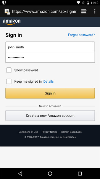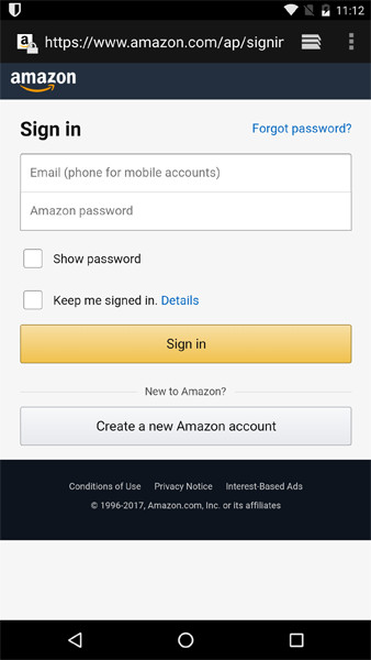 Now let's start using it! Go to a website like Amazon.com in your web browser. Whenever you encounter a screen that has a password text field on it, Bitwarden will spawn a notification. Look for the Bitwarden icon in the top notification bar. Swipe down to open your notifications and tap on the Bitwarden auto-fill notification.