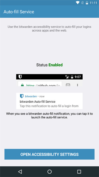 This opens a screen that will give some information about how to activate the Bitwarden Auto-fill Service.